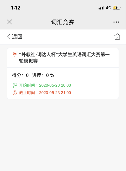 报名参加 “外教社•词达人杯”的同学请注意,5月23日本周六(明天)晚上20:00-21:00系统有一次模拟竞赛的机会。模拟竞赛不计入正式成绩,旨在熟练竞赛流程,练练手。每人只有一次模拟机会,模拟竞赛题型、题量与正式比赛一致。