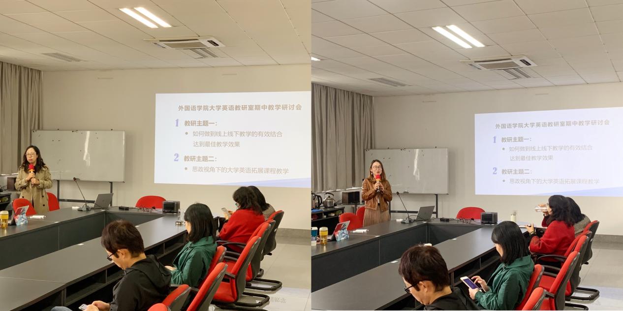 教学研讨会环节就“如何做到线上线下教学的有效结合,达到最佳教学效果”及“思政视角下的大学英语拓展课程教学”两个主题,王晨曦老师和唐晓磊老师进行了主题内容的探讨。