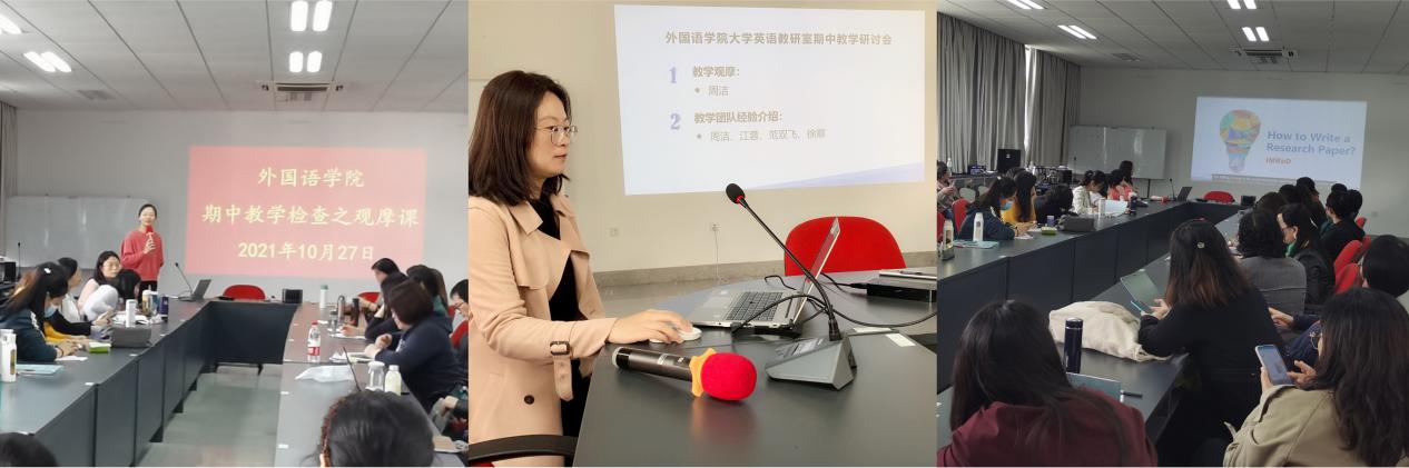 教学观摩环节由获得第十二届“外教社杯”全国高校外语教学大赛江苏省赛区本科组微课二等奖获得者周洁老师授课,周洁老师以“Research Paper Structure--IMRad”研究论文的基本结构和写作方法为主题,展示了课堂教学内容和团队合作的成果。观摩后,周洁老师及其团队教师就微课的设计和制作进行了经验分享和交流,与会老师们讨论热烈。大家一致认为该授课教学步骤清晰合理且具有创造性,将学术专业知识点的讲解融入到语言教学过程中,启发性强,团队精湛的多媒体制作、丰富的教学材料和精心的教学设计令人印象深刻。