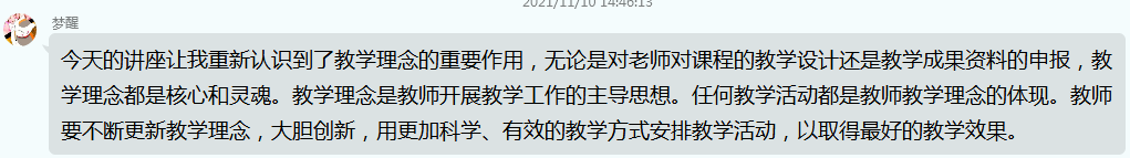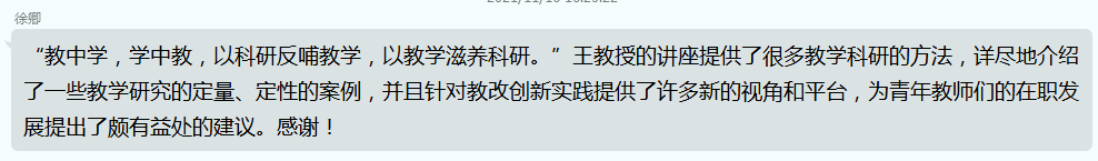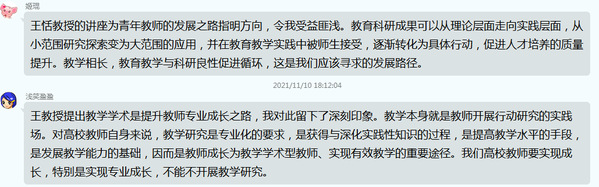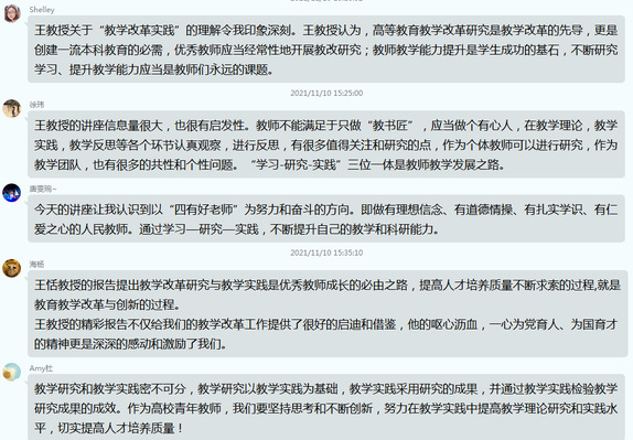 第一场讲座结束后,老师们进行热烈讨论,表示讲座信息量大,受益匪浅。在青年教师面临巨大变革和挑战的今天,王恬指出我们应当遵循“学习-研究-实践”三位一体的发展道路,给了大家深刻启发,“教中学,学中教,以科研反哺教学,以教学滋养科研”让大家明白只做一名“教书匠”是远远不够的,我们应当以“四有好老师”的标准要求自己,做到“有理想信念、有道德情操、有扎实学识、有仁爱之心”,一心“为党育人、为国育才”。