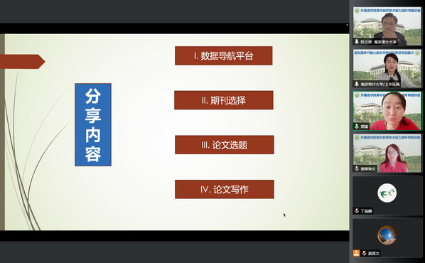 讲座中,郭夷从数据导航平台的使用、国际期刊的选择、论文选题技巧和论文写作技巧四个方面分享了自己的学术经验。她介绍了汤森路透和中科院国际期刊分区的方法,并对常见国际期刊的出版社信息、期刊特点和投稿要求进行逐一介绍,指导教师们通过作者定位法、期刊定位法、话题定位法跟踪相关领域的前沿动态,通过“由理论到理论”和“由实践到理论”两种途径进行选题。她特别提出,论文写作如果能针对实际问题进行深入分析,并提出解决方案,会提高论文的录用几率,例如就新冠肺炎疫情,可以锁定特效药、人机合力等“潜力股”热点话题,展开创新研究,讲好中国故事。
