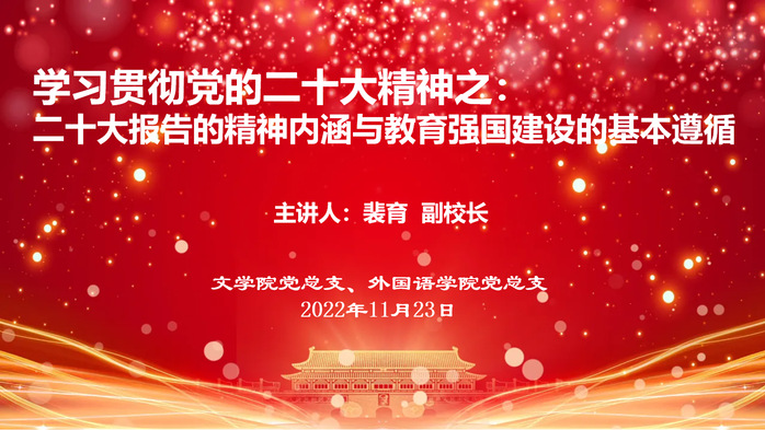 裴育在党课中首先回顾了党的二十大的基本概况,讲述了大会主题、大会议程、代表构成、选举结果、党章修改和党的二十大报告的形成过程等重点信息。接着从六个方面引导广大党员教师深刻领会党的二十大精神,指出要深刻把握党的二十大的重要意义、深刻把握过去5年的工作和新时代10年的伟大变革、深刻把握开辟马克思主义中国化时代化新境界的历史责任、深刻把握以中国式现代化推进中华民族伟大复兴的使命任务,深刻把握全面建设社会主义现代化国家的目标任务,深刻把握以伟大自我革命引领伟大社会革命的重要要求。他重点列举了党的二十大报告中12处关于教育的阐述,高屋建瓴、深入浅出地厘清了党对教育事业发展的系列部署,号召全体党员要积极行动起来,深入推进党的二十大精神入脑入心,为建设教育强国贡献力量。