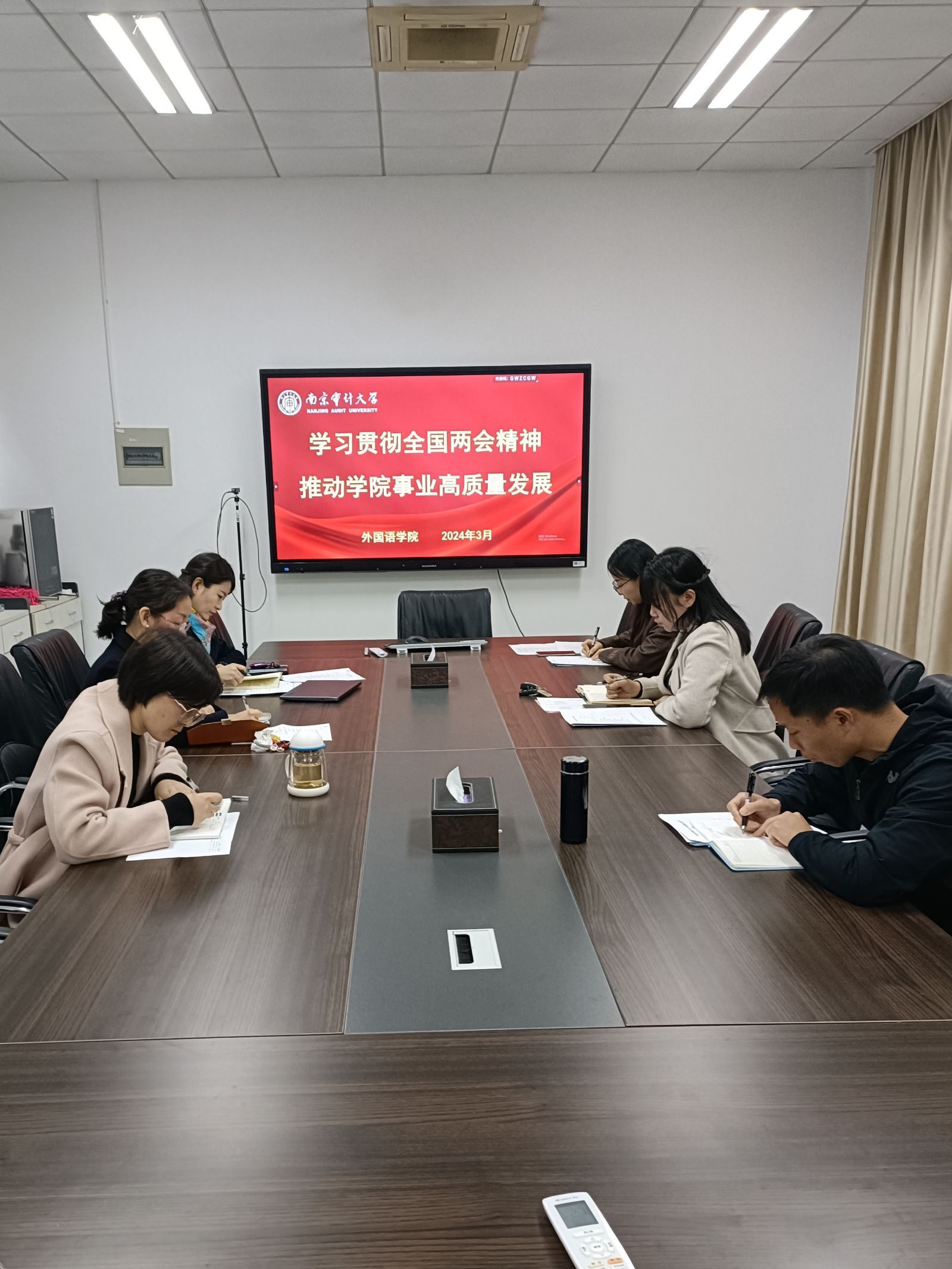 公司大会上,钱永红作主题为“学习贯彻全国两会精神 推动公司事业高质量发展”的专题学习报告,以2024年全国两会报告主要内容、学习金句、总书记两会强调的关键词为主要内容进行领学,并部署公司“党建+业务”“外语+审计”双融合特色党小组行动计划,以此增进教师在教学科研工作中研习交流,互帮互助,共同进步,推进公司事业发展,提高人才培养服务质量。张薇结合两会精神学习与公司事业发展实际,就当前公司学科专业建设、人才引进、一流专业一流课程、翻译专业硕士点申报、法语新增专业开设等工作进展情况在大会上做了报告,充分肯定了当前公司取得的成绩和良好发展态势,对公司学科专业发展充满信心,同时也勉励全体教师继续攻坚克难、坚定信心、鼓足干劲,不断提升自身的同时以实际行动为公司事业发展作贡献。梁君则结合今年本科公司产品审核评估工作重要任务,对公司本科公司产品审核评估落实各项工作做精心部署,希望全体教师凝心聚力、奋楫扬帆,圆满完成审核评估工作,以实际行动贯彻落实两会精神。