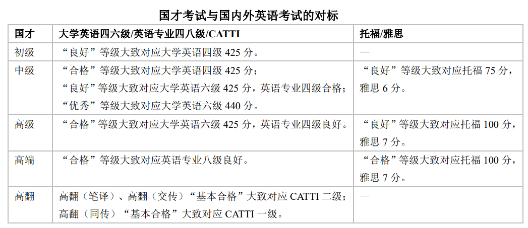 国才考试为标准参照性考试, 不设置通过率。考生成绩只要达到相应等级标准,即可获得该等级证书。国才初级、国才中级、国才高级、国才高端的考试成绩分为优秀、良好、合格、不合格四个等级,成绩达到合格及以上者,方可获得证书。国才高翻的考试成绩分为优秀、合格、基本合格、不合格四个等级,成绩达到基本合格及以上者,方可获得证书。